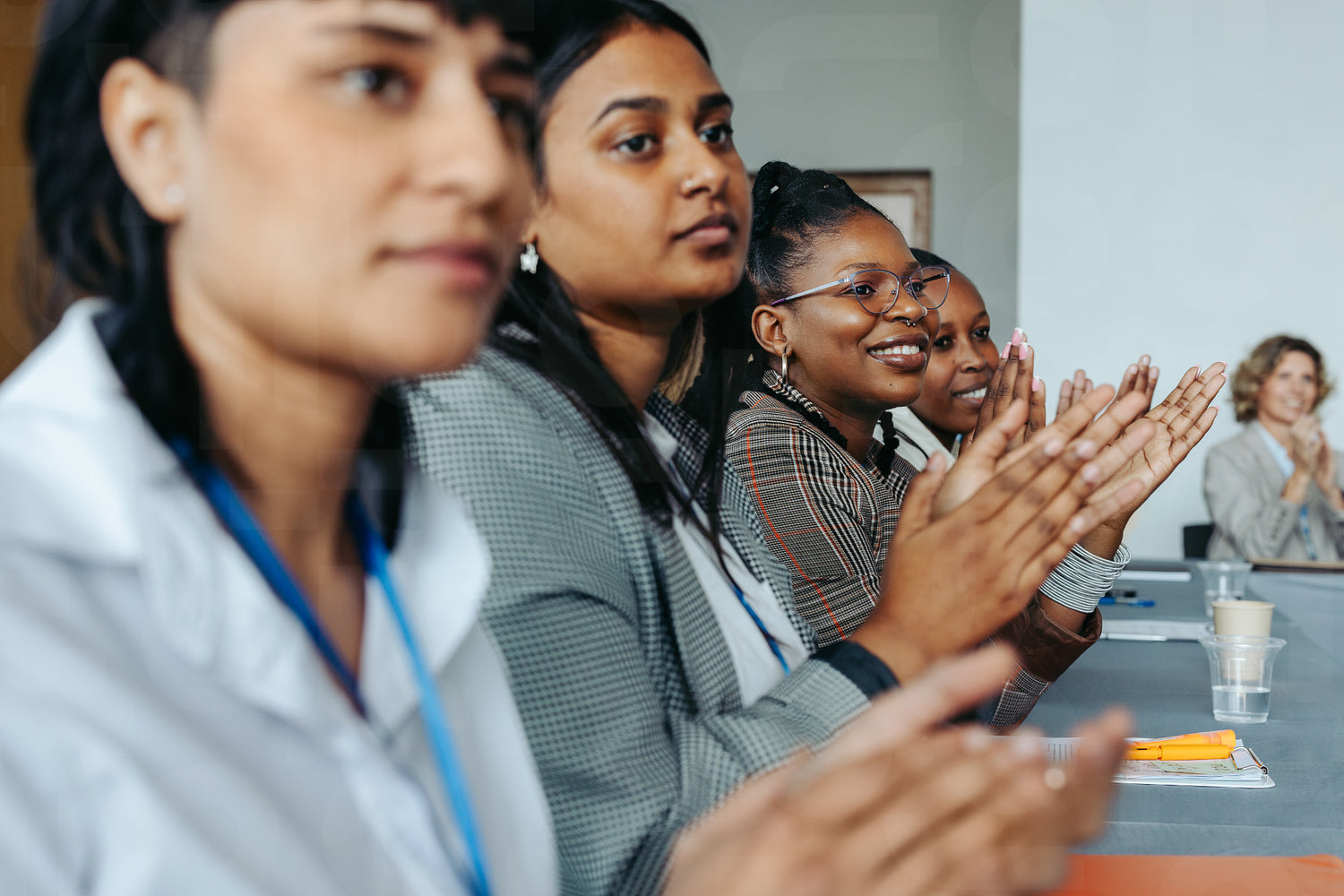 Diverse group of businesswomen applauding during a professional presentation at a business conference meeting.