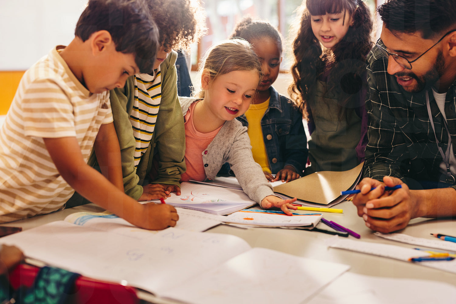 Group of children doing an art project with their teacher. Elementary school students enjoy drawing using colouring pencils. Creativity as part of early child development.