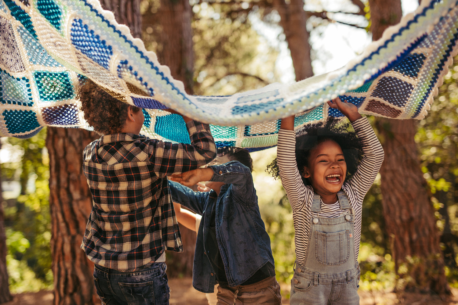 Four kids in park with picnic blanket. Group of children enjoying together in park.