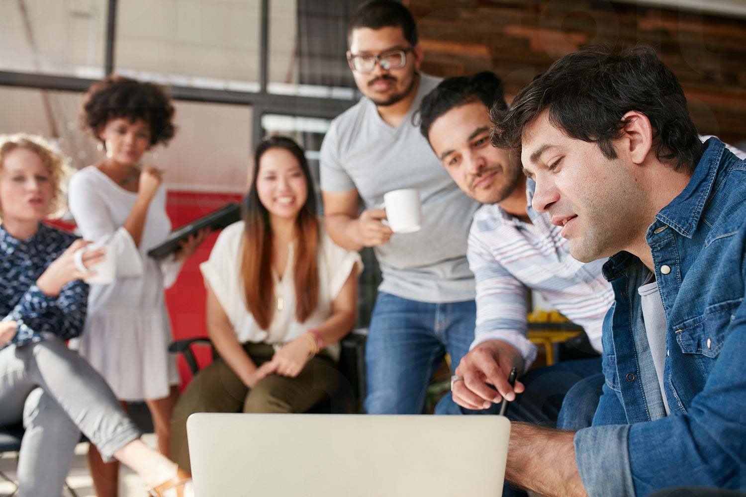 Group of young business people together in a meeting and having a discussion on new creative project. Young designer showing something to team startup meeting.