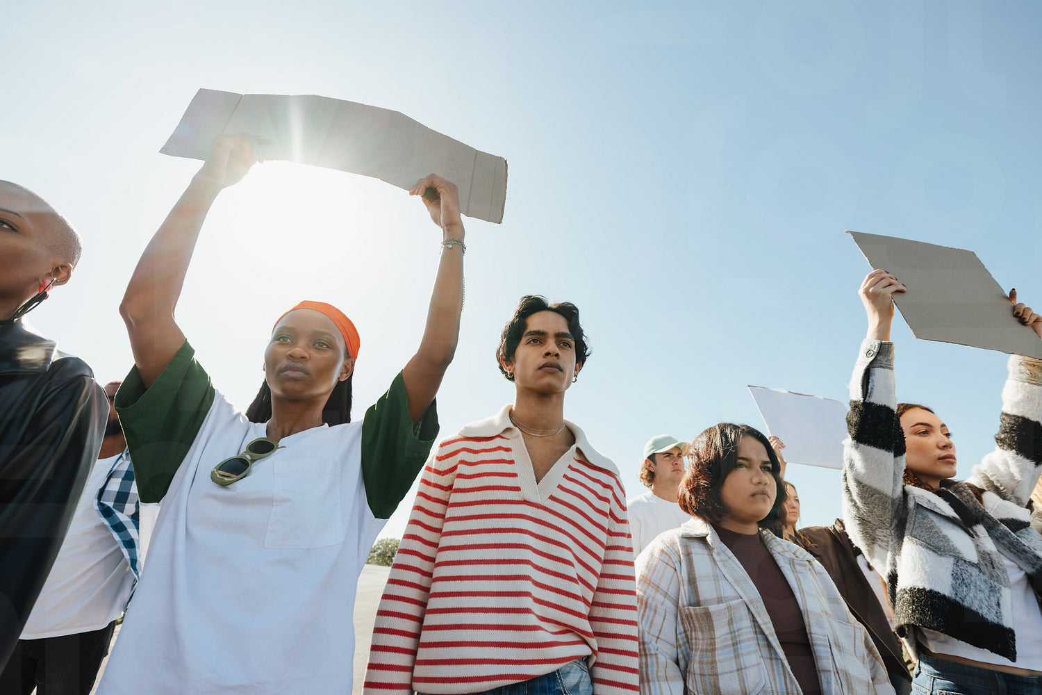 A group of individuals participates in a peaceful demonstration, advocating social justice and equality. They hold signs and show solidarity for the cause while standing under clear skies.