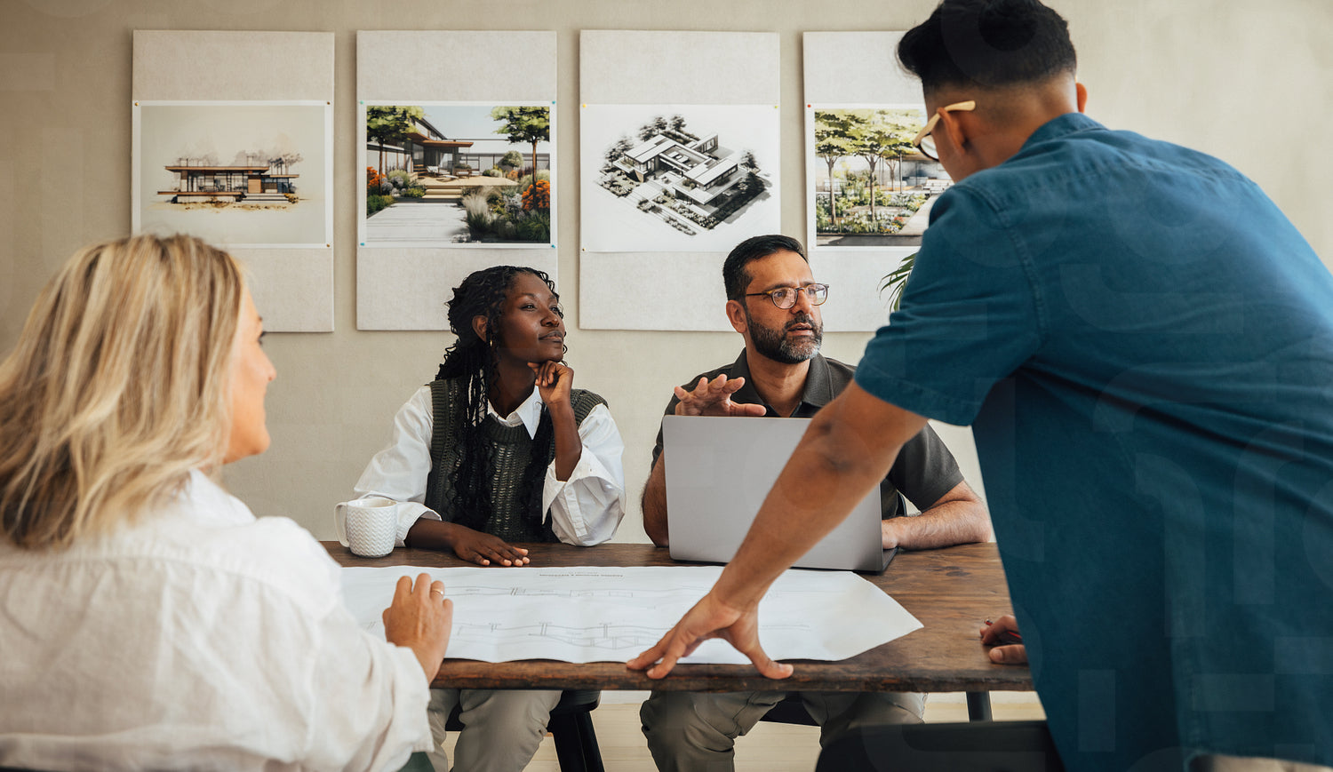 A group of diverse young professionals working together on a project in an architectural firm. The team is actively engaged in planning and discussing ideas for innovative designs.