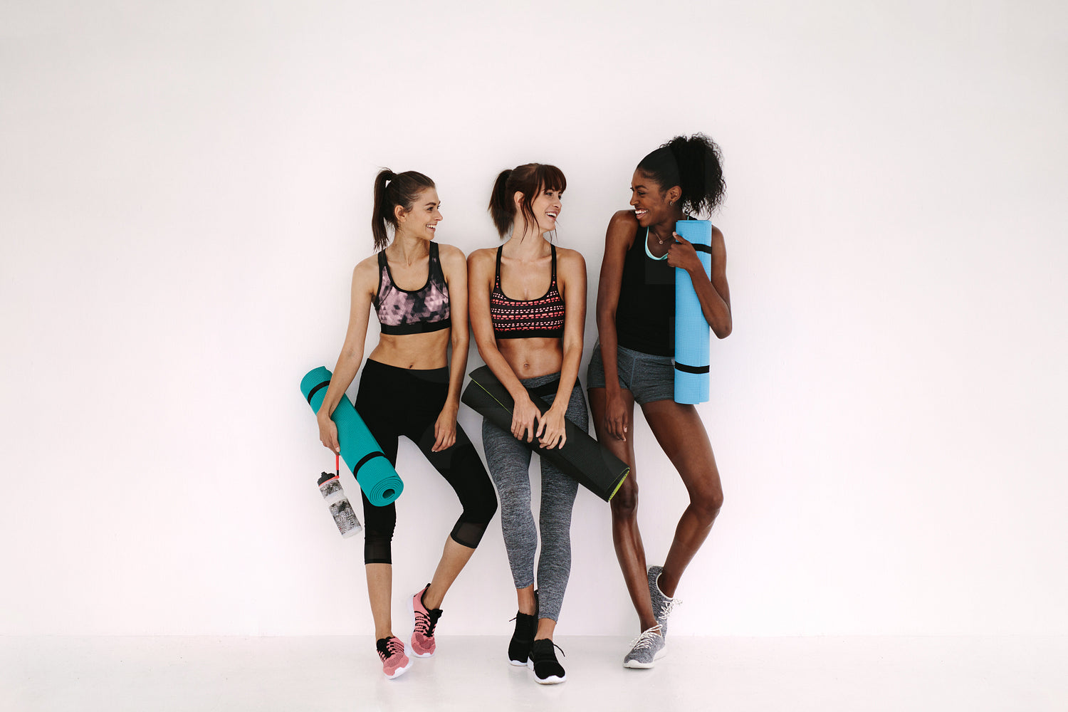 Group of female friends in sportswear smiling together while standing in a gym after yoga workout. Women standing by a wall with exercise mat.