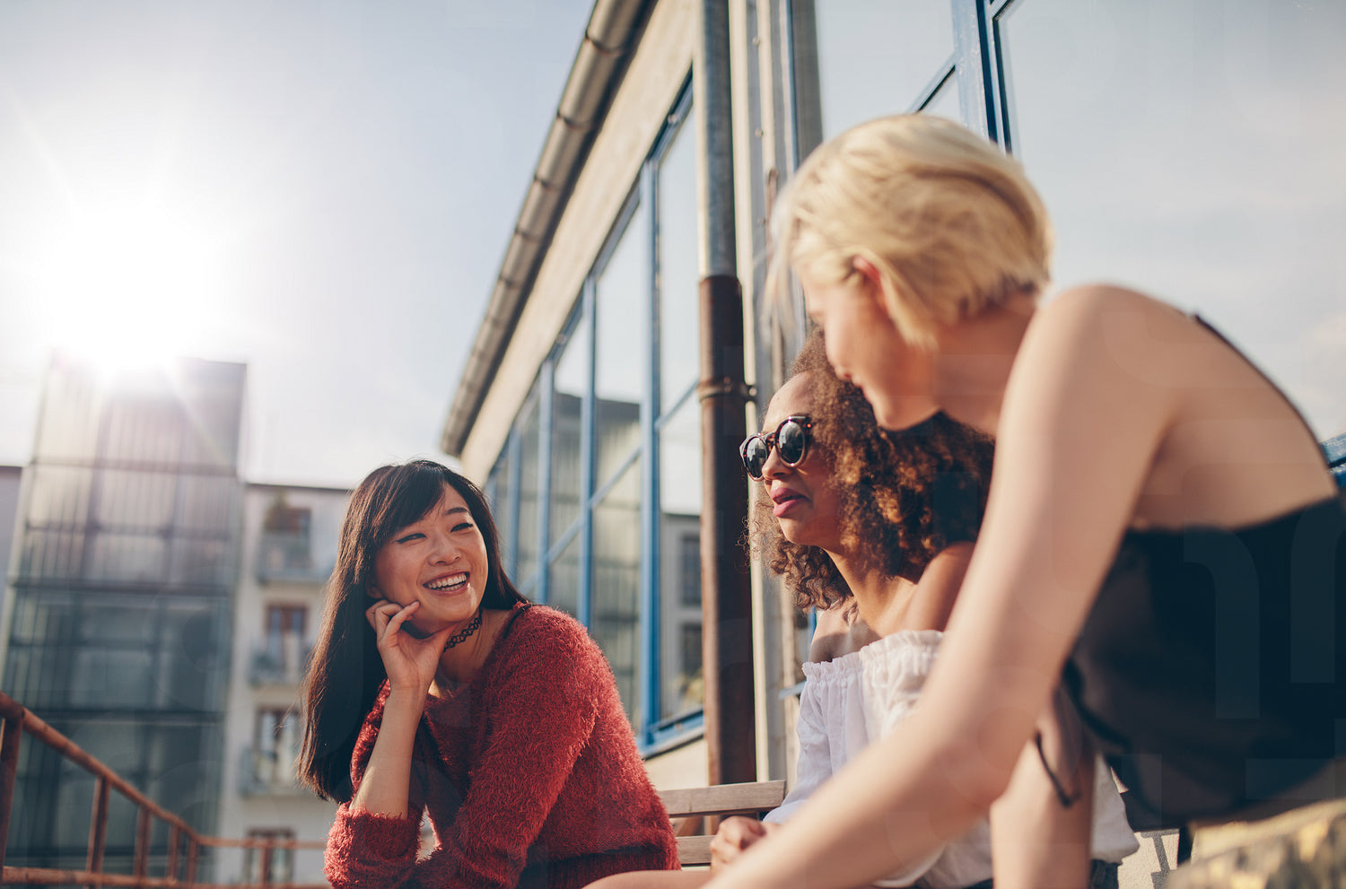 Group of female friends talking in a terrace. Three young women meeting at outdoor cafe chatting and enjoying.