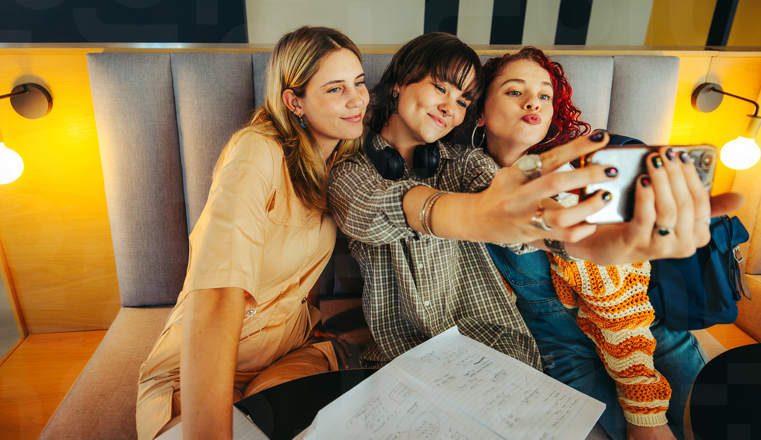 Group of female students taking a selfie in a cozy study space with notebooks and lamps around them