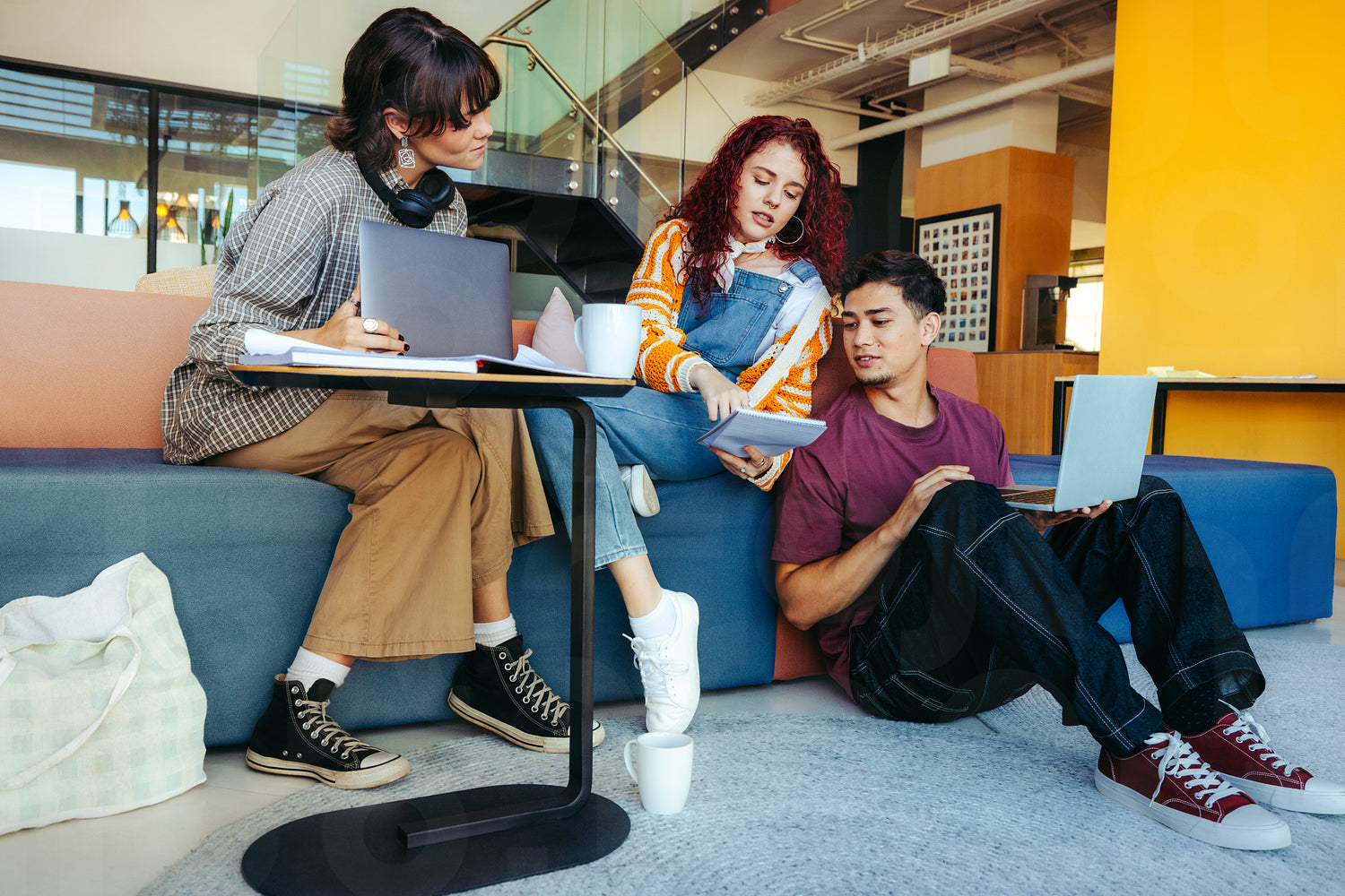 Friends working together on an undergrad project, showcasing collaboration and teamwork in a comfortable and modern environment.