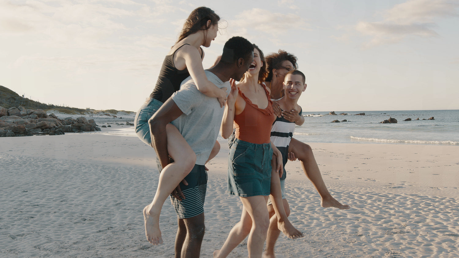 Two happy young men giving their girlfriends piggyback rides at the beach. Group of friends enjoying beach holidays.