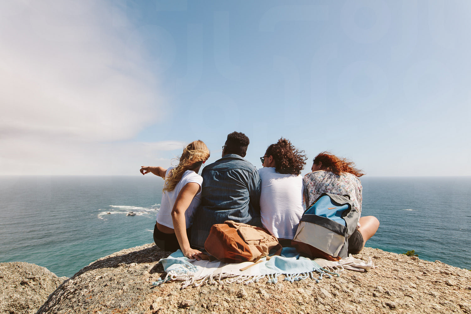 Group of friends on top of hill and enjoying view. Young people sitting on top of a mountain and looking at sea.