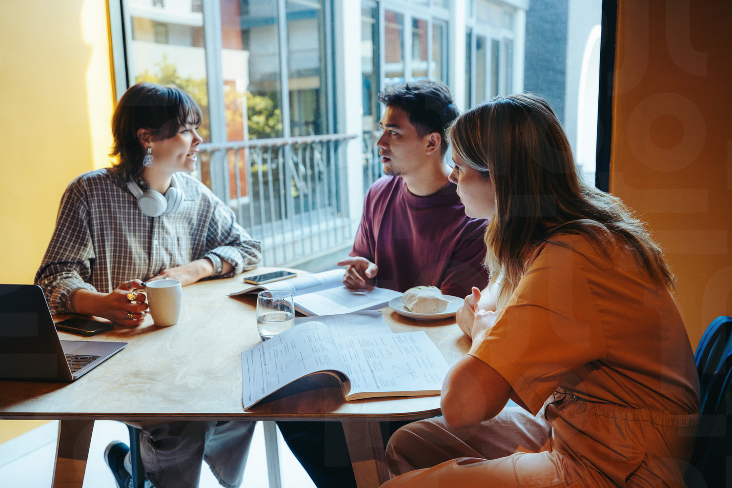 Friends engage in an interactive study session, sharing ideas over coffee at a sunlit cafe, fostering collaboration and learning.
