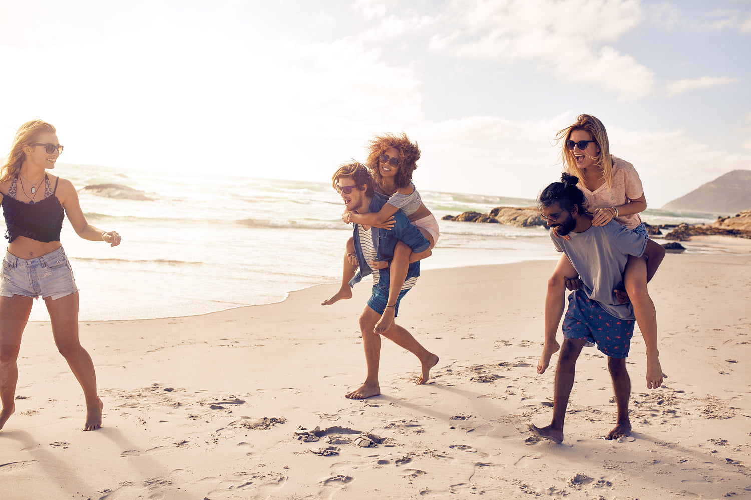 Group of friends having fun on the beach vacation, men piggybacking women.