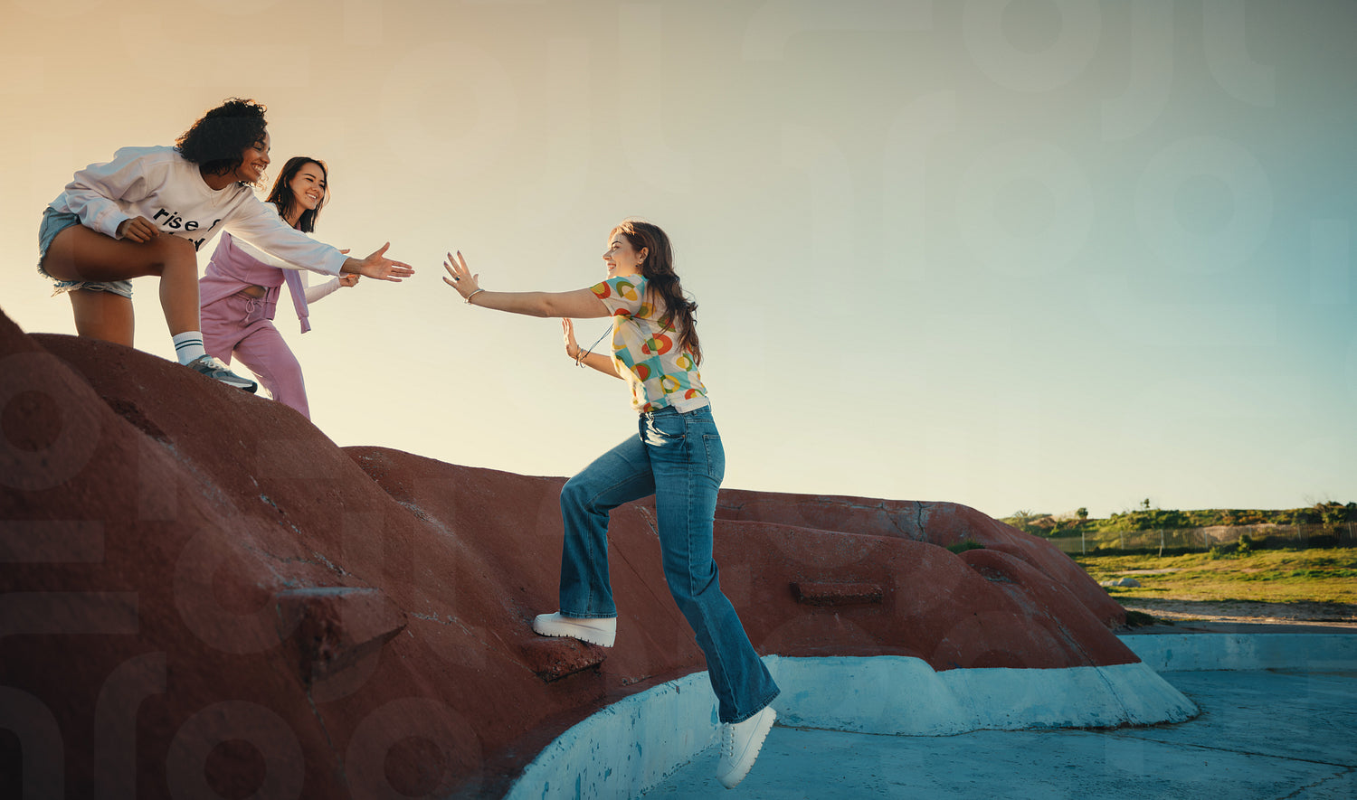 Group of friends supporting each other as they climb a structure in an outdoor setting. Concept of teamwork, support, and friendship.