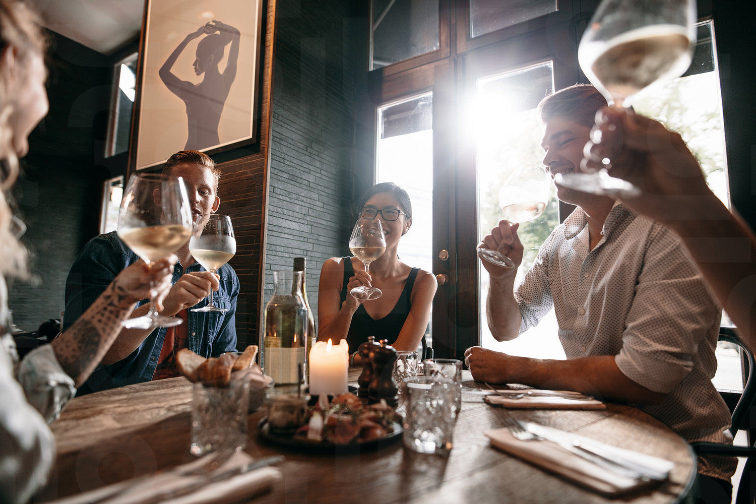 Diverse group of young people having wine at restaurant. Men and women meeting at a restaurant for dinner.