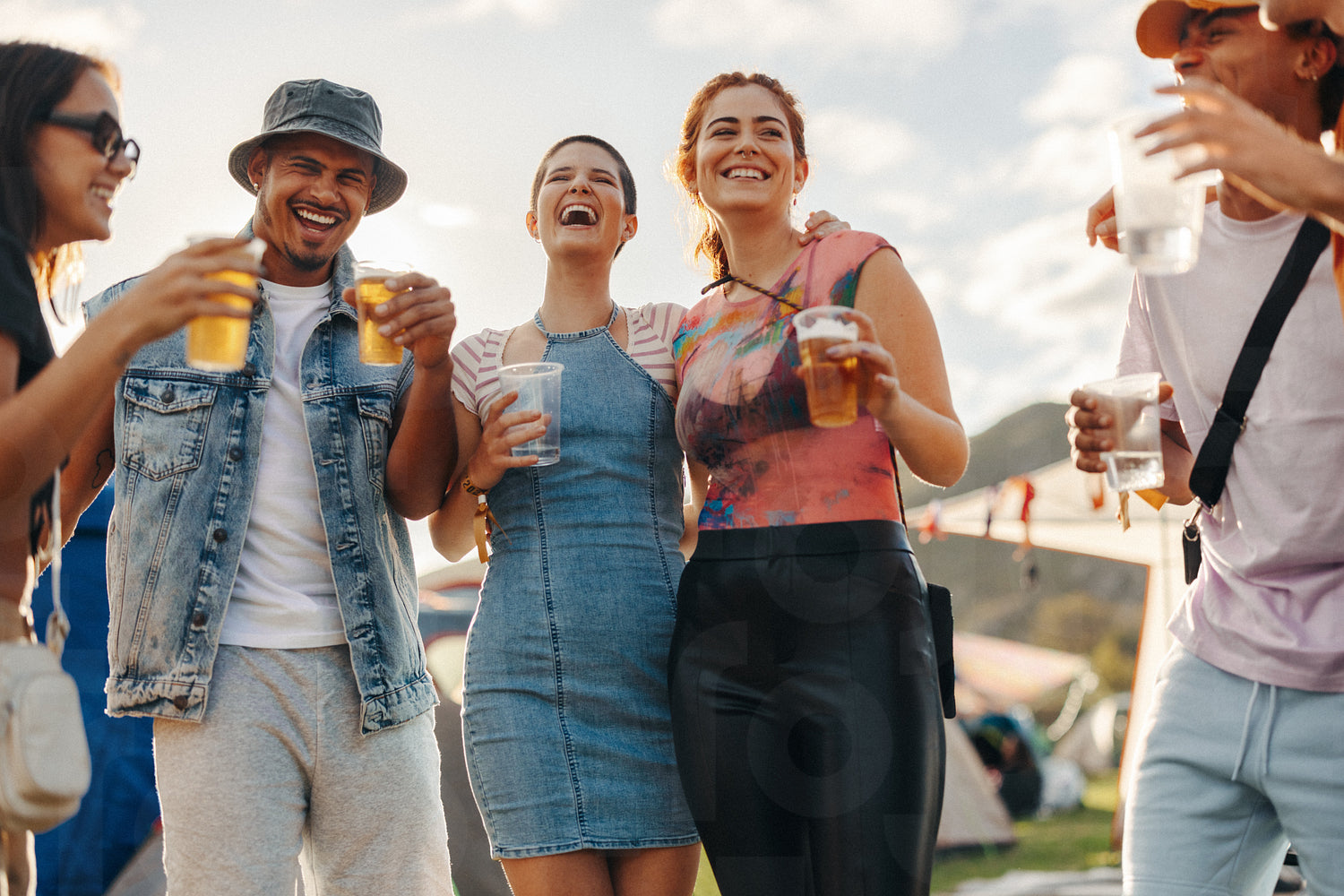 Group of friends sharing heartfelt moments, laughter and chilled drinks in the spirited ambiance of a summer festival. Happy friends having fun together at a music festival. This photo has intentional use of 35mm film grain.