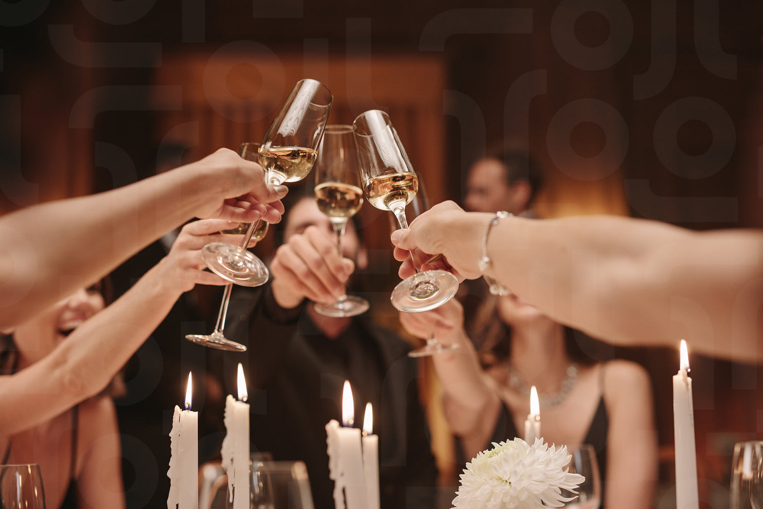 Group of men and women toasting champagne at a dinner party. Group of friends celebrating with drinks at gala night.
