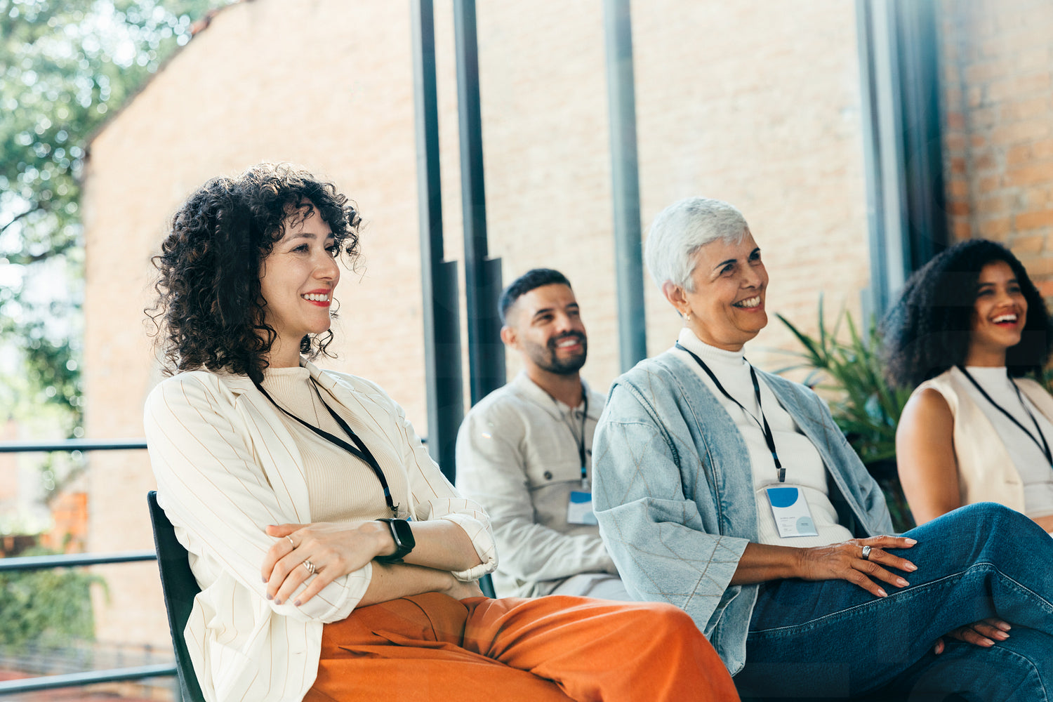 A group of happy and confident employees attentively listening and smiling during a meeting, reflecting positive workplace dynamics.