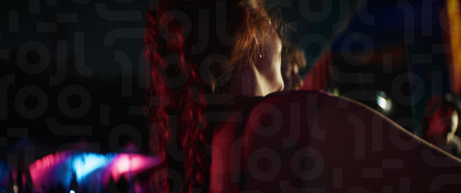 Young woman enjoying herself at a music festival surrounded by colorful lights and people dancing to the music. Captured using an anamorphic lens and presented in the 2.39:1 CinemaScope aspect ratio.