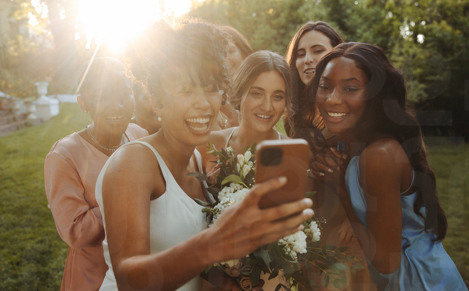 A group of happy women pose joyfully for a selfie during a sunny outdoor wedding. The scene captures their laughter, friendship, and celebratory spirit, accentuated by natural light.