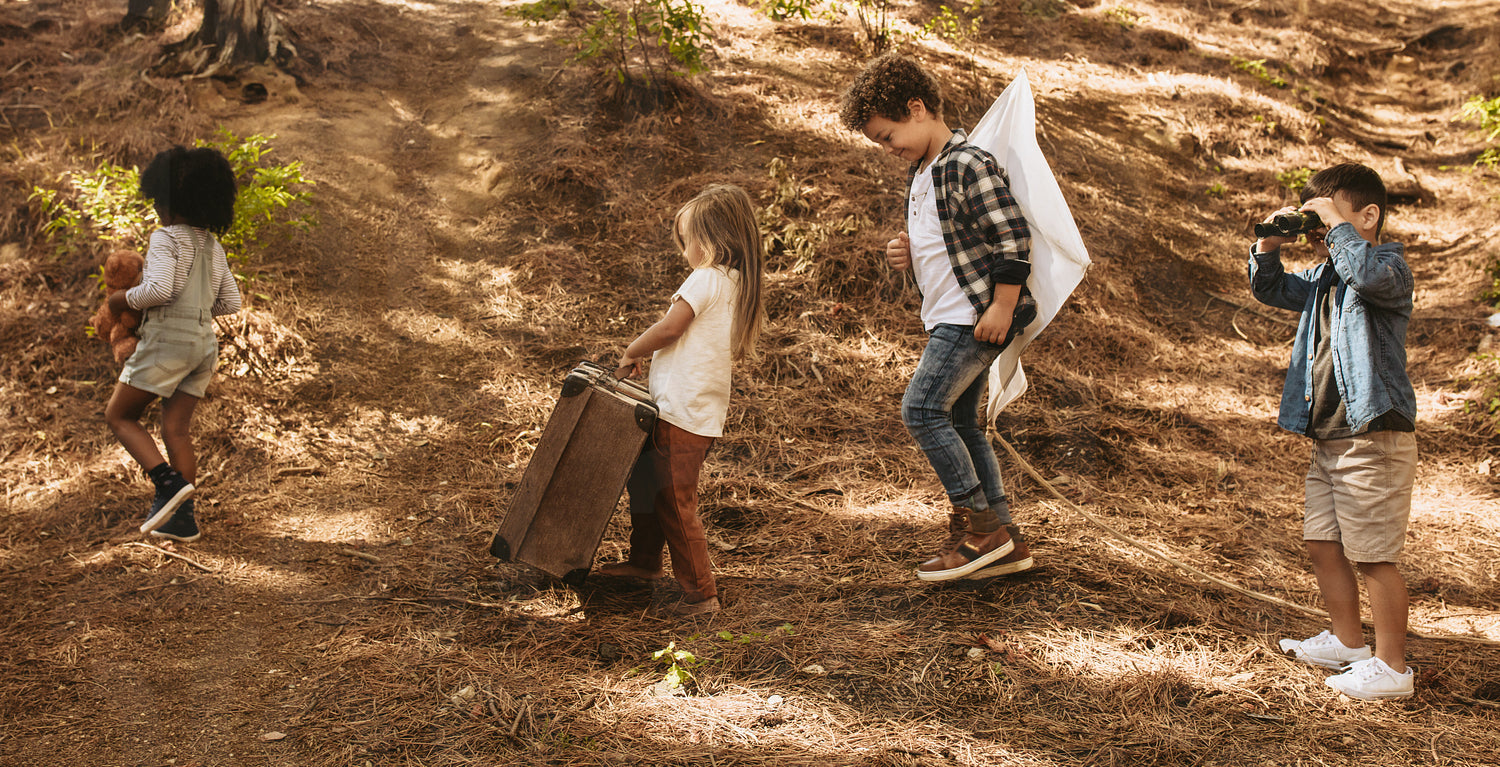 Group of children walking in the forest with their toys. Boys and girl with teddy bear, old suitcase, kite and binoculars.