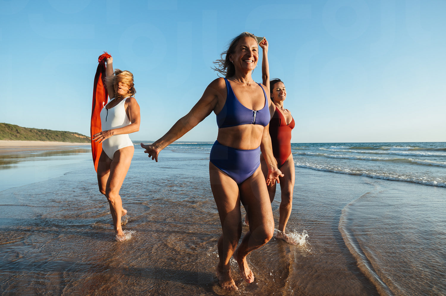 Three mature women laughing and enjoying their time together at a sunny beach. The group shares a cheerful moment walking through shallow water, capturing the essence of freedom and friendship.