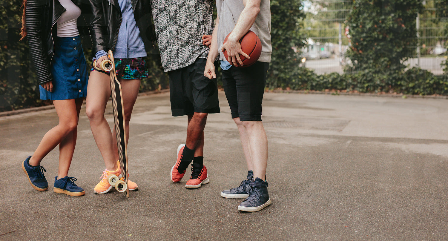 Cropped shot of group of people standing together with basketball and skateboard. Low angle shot with focus on men and women legs.