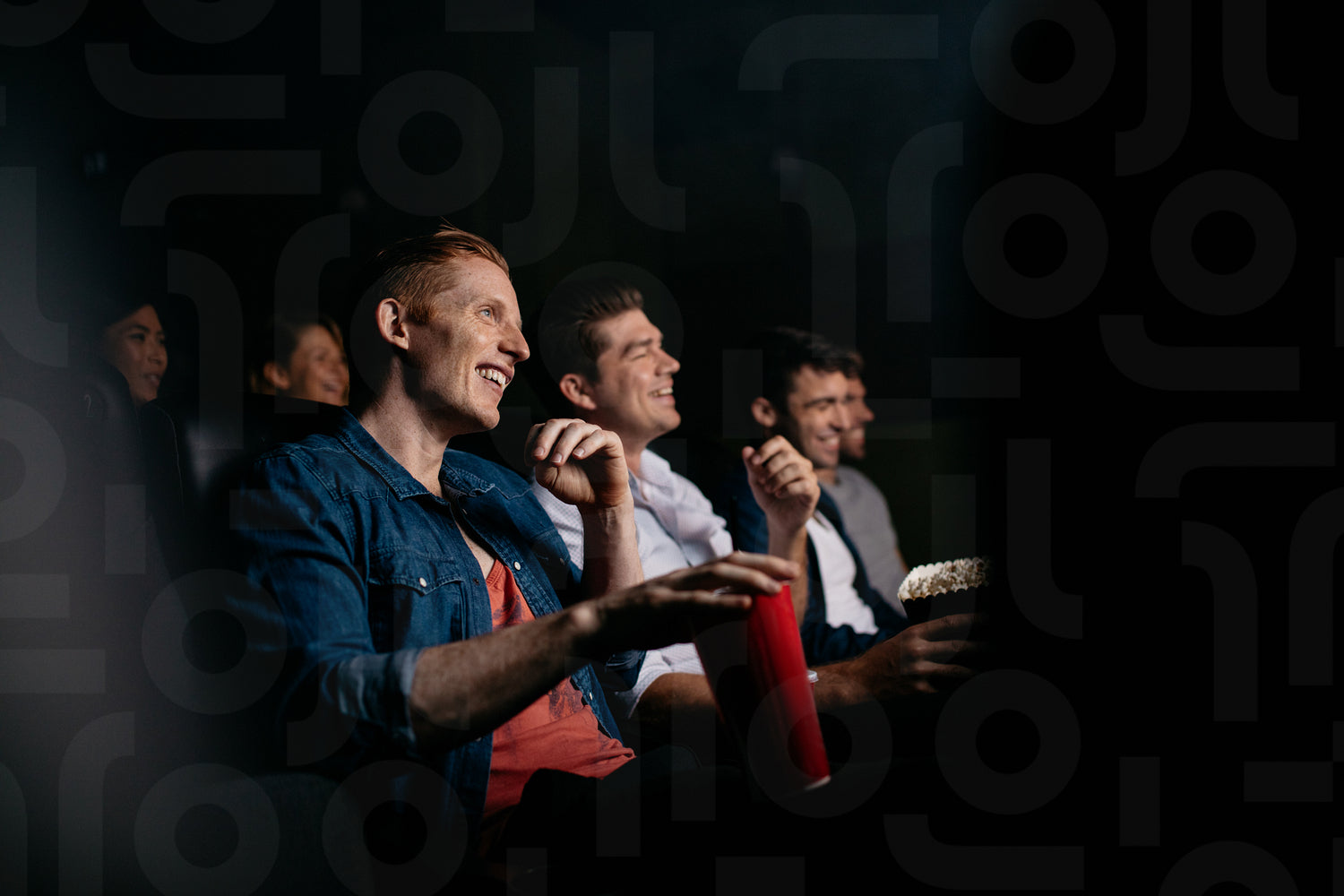 Smiling young man with friends in cinema hall watching movie. Group of people watching movie in theater.