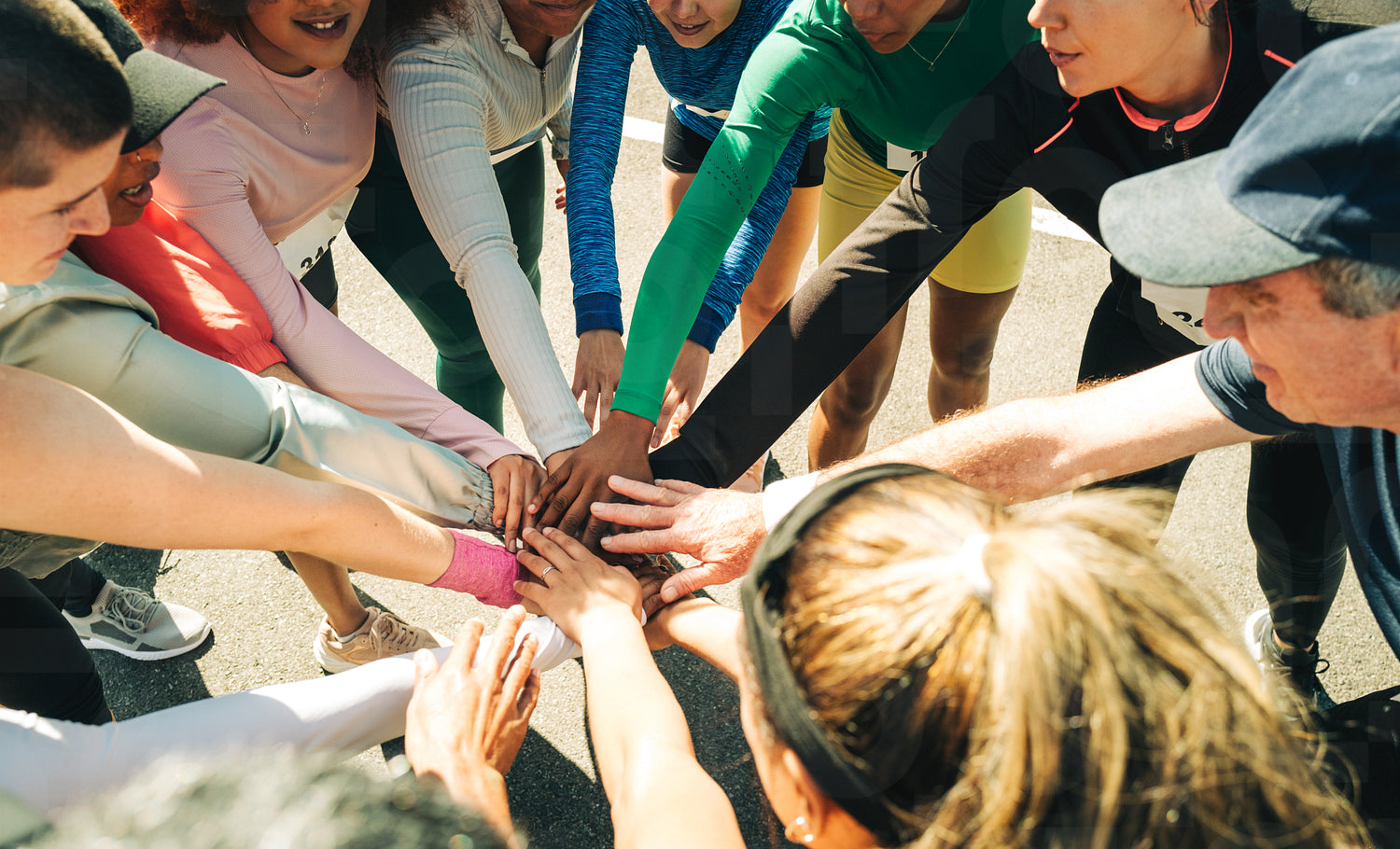 A diverse group of runners join hands in a huddle, embodying teamwork and camaraderie. They are preparing for a marathon, demonstrating unity and motivation and emphasizing the spirit of running clubs.