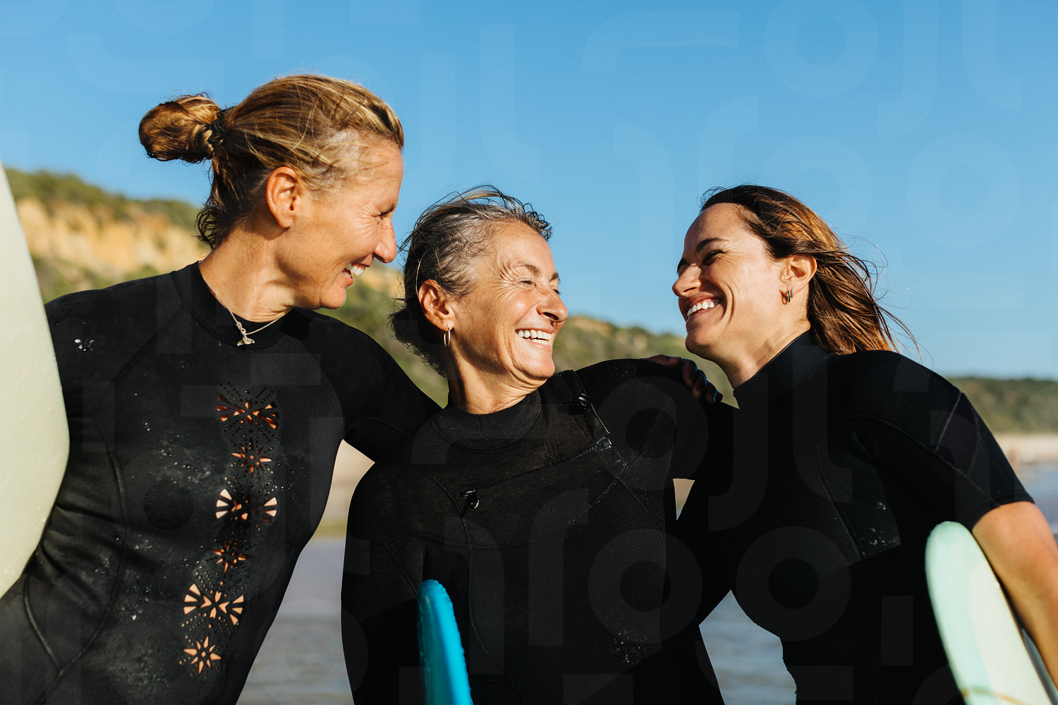 Three female friends in wetsuits holding surfboards, enjoying a sunny day at the beach. This image captures a moment of joy, friendship, and the love of surfing in picturesque surroundings.