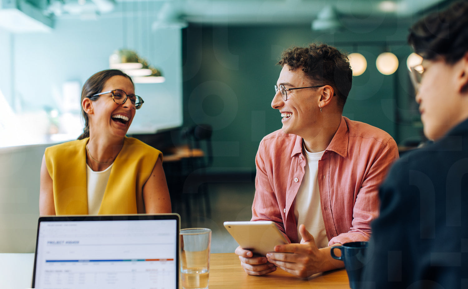 Three young individuals enjoy a friendly conversation while working in a casual office environment. The atmosphere is vibrant, suggesting teamwork, interaction, and mutual collaboration.