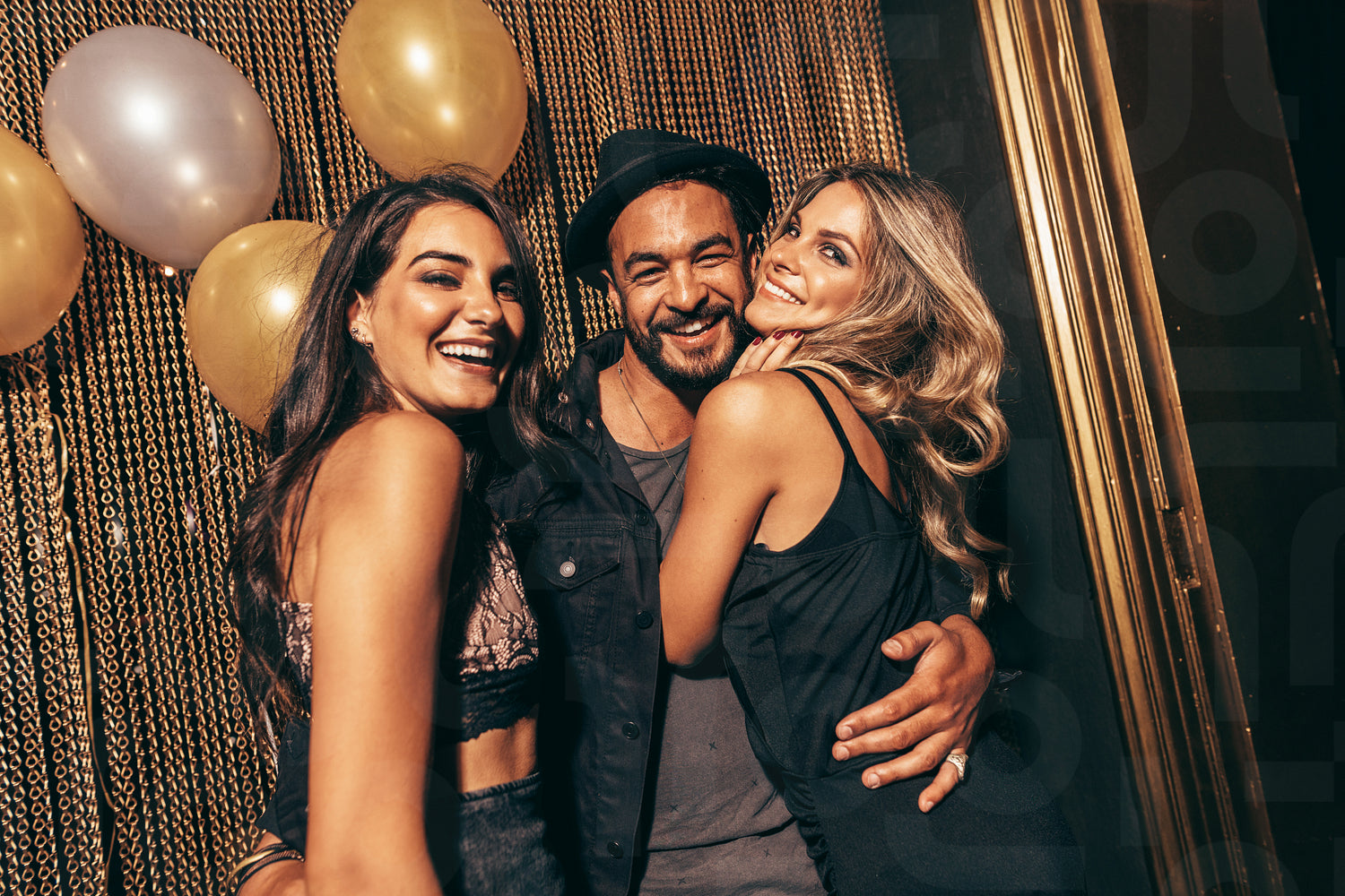 Portrait of handsome man with female friends at disco. Young friends in a party at nightclub.