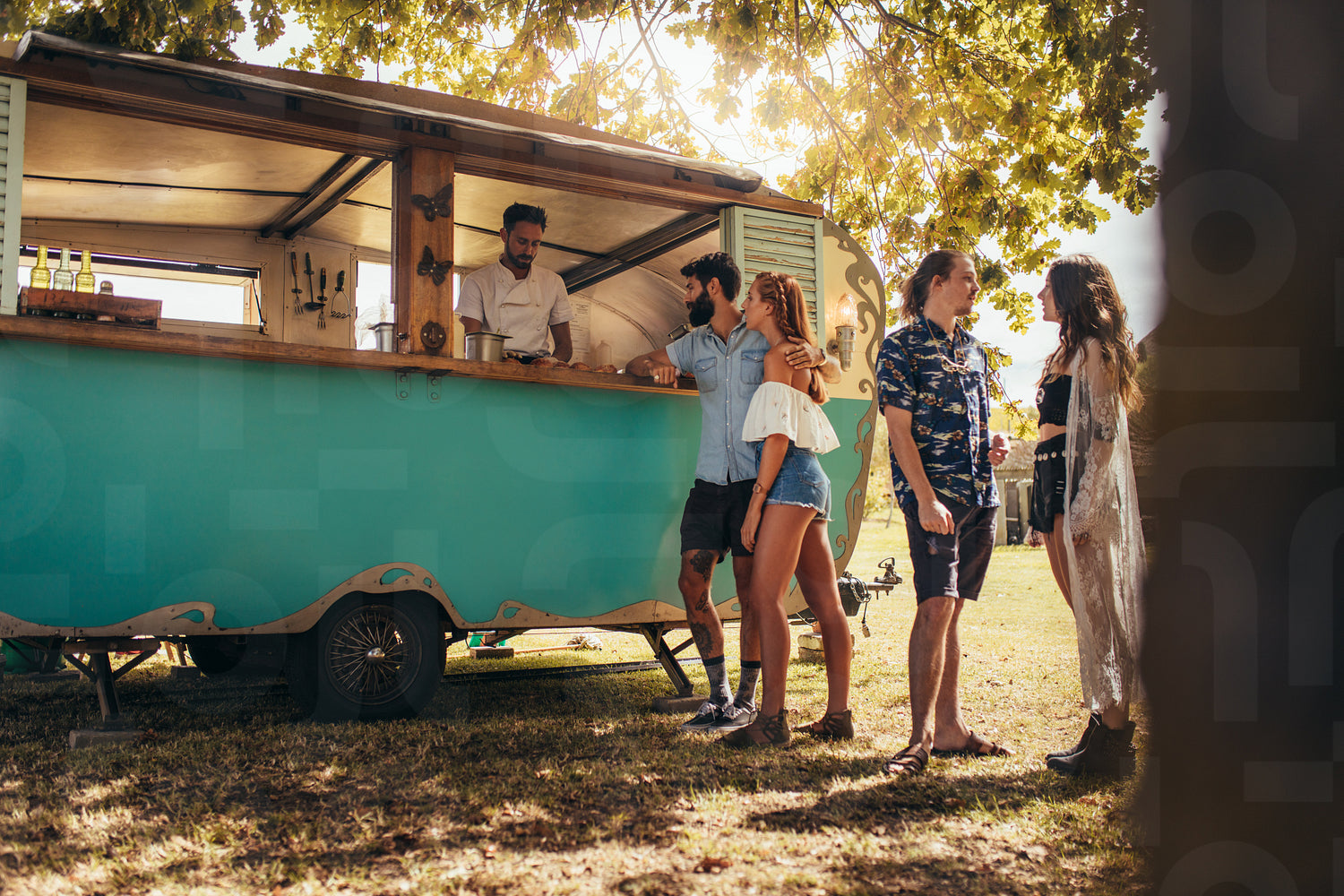 Young people buying street food from a food truck at park. Group of men and woman at food truck.