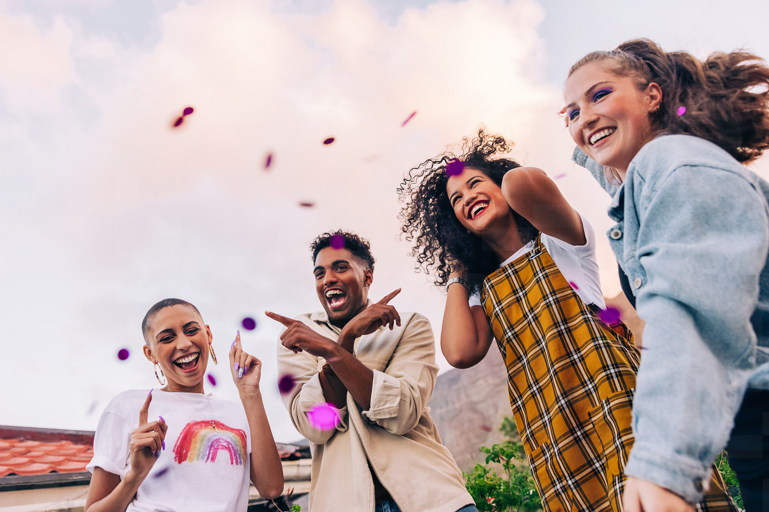 Group of young people dancing during a party on the rooftop. Four happy friends celebrating under falling confetti. Multicultural friends laughing and having fun on the weekend.