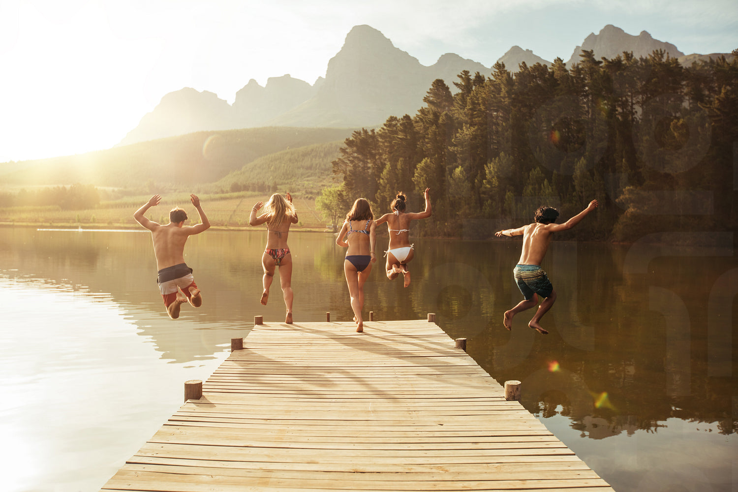 Group of young people jumping into the water from a jetty. Group of friends jumping from pier in the lake on a sunny day.