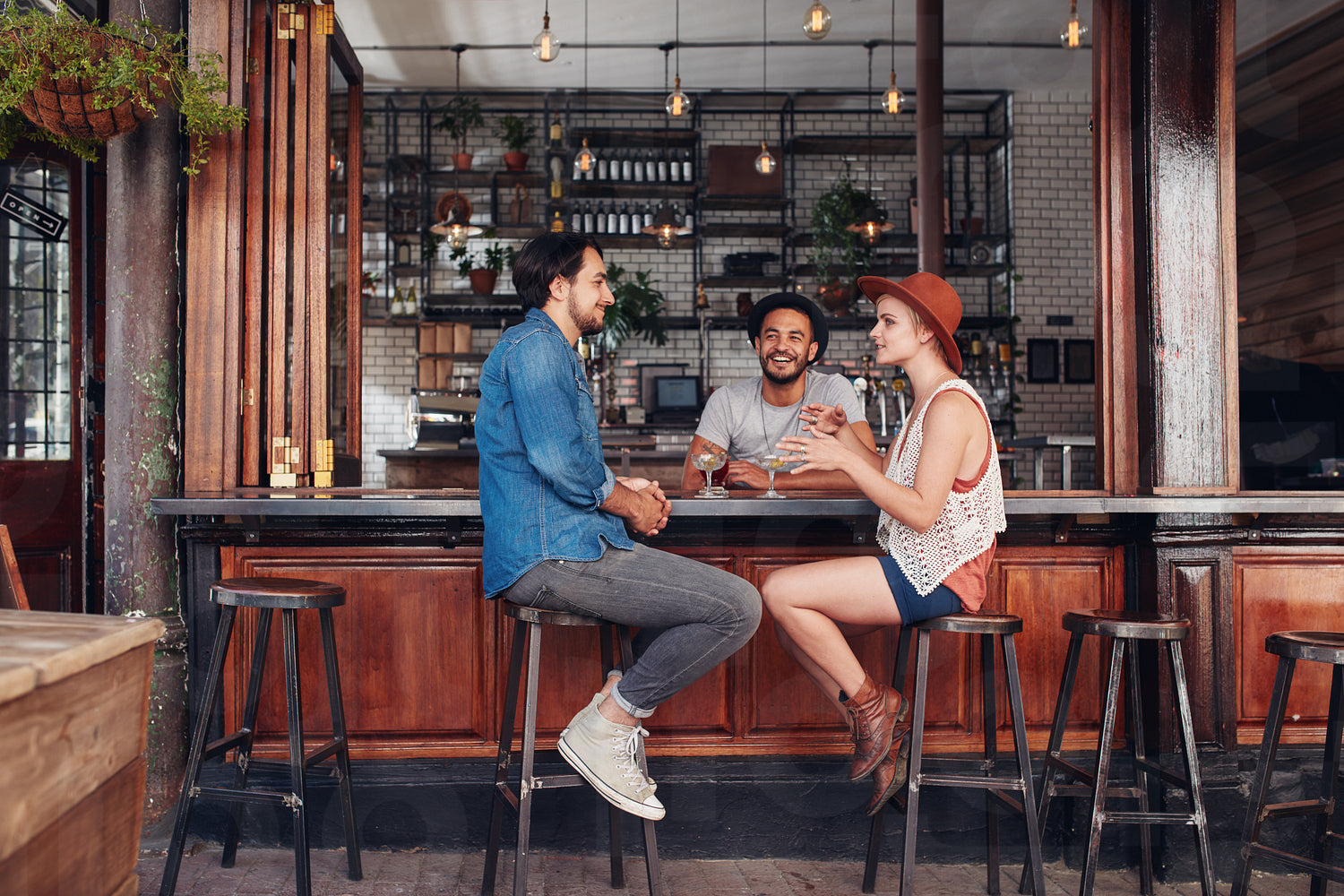 Portrait of happy group of young people meeting in a coffee shop and talking. Three young friends sitting at a cafe table.