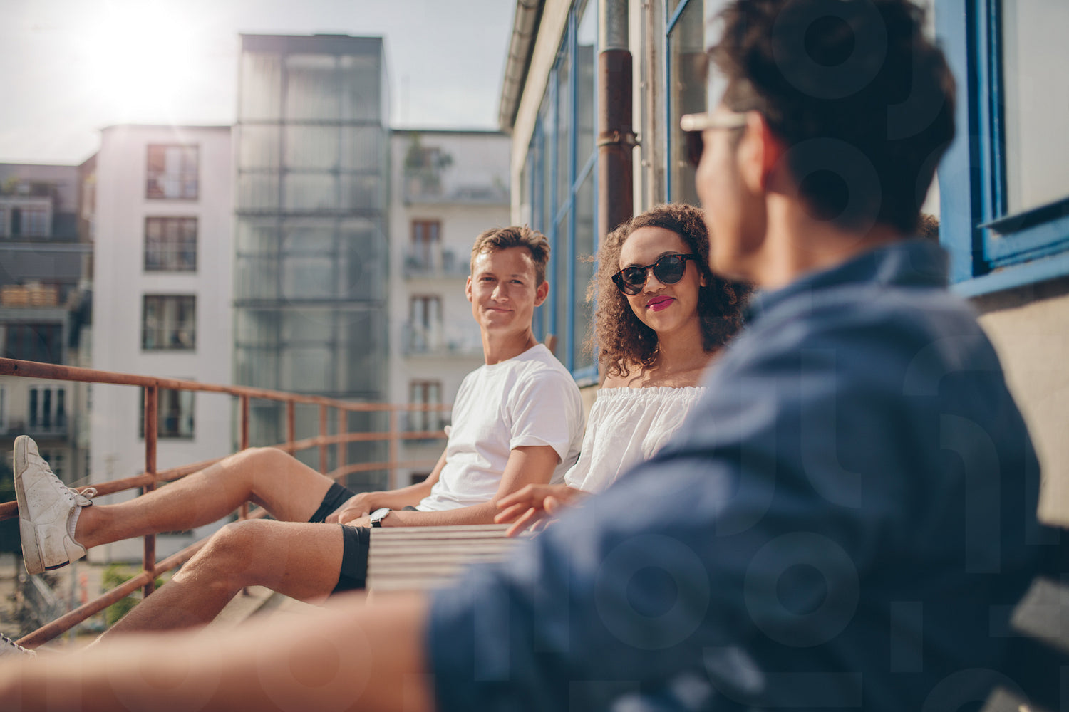 Shot of young woman sitting with her friends at outdoor cafe. Group of young people relaxing in a balcony.