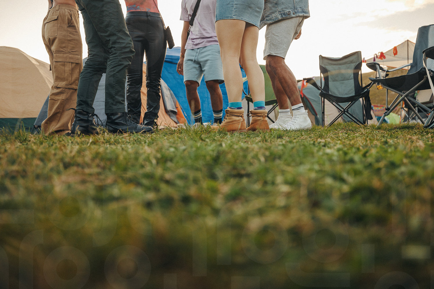 Diverse group of young people stands together at a music festival camp, united by their love for fun and the vibrant atmosphere surrounding them. Friends having a good time during summer. This photo has intentional use of 35mm film grain.