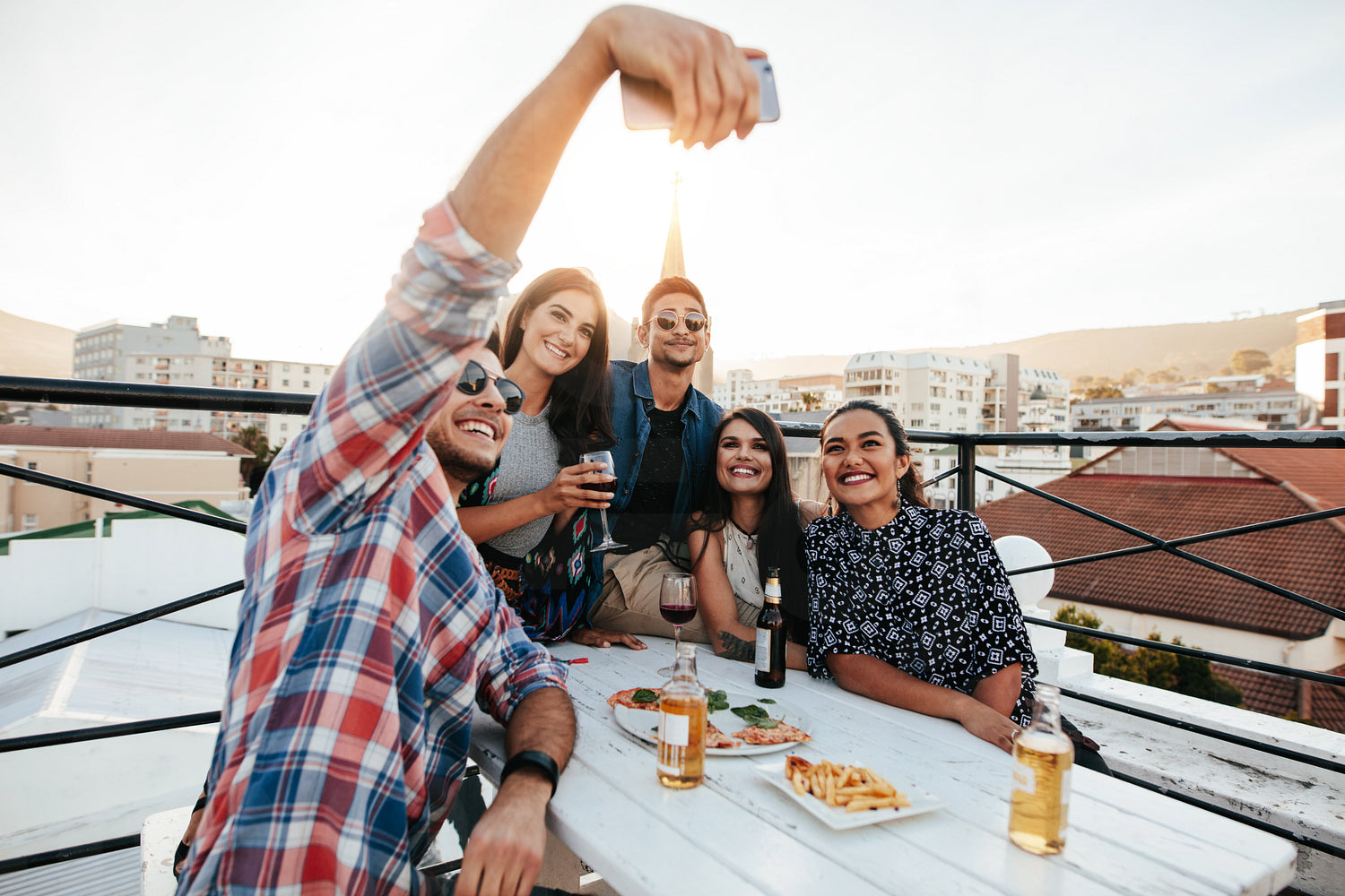 Group of friends having a party on the rooftop making a selfie. Happy and joyful young people taking self portrait during rooftop party.