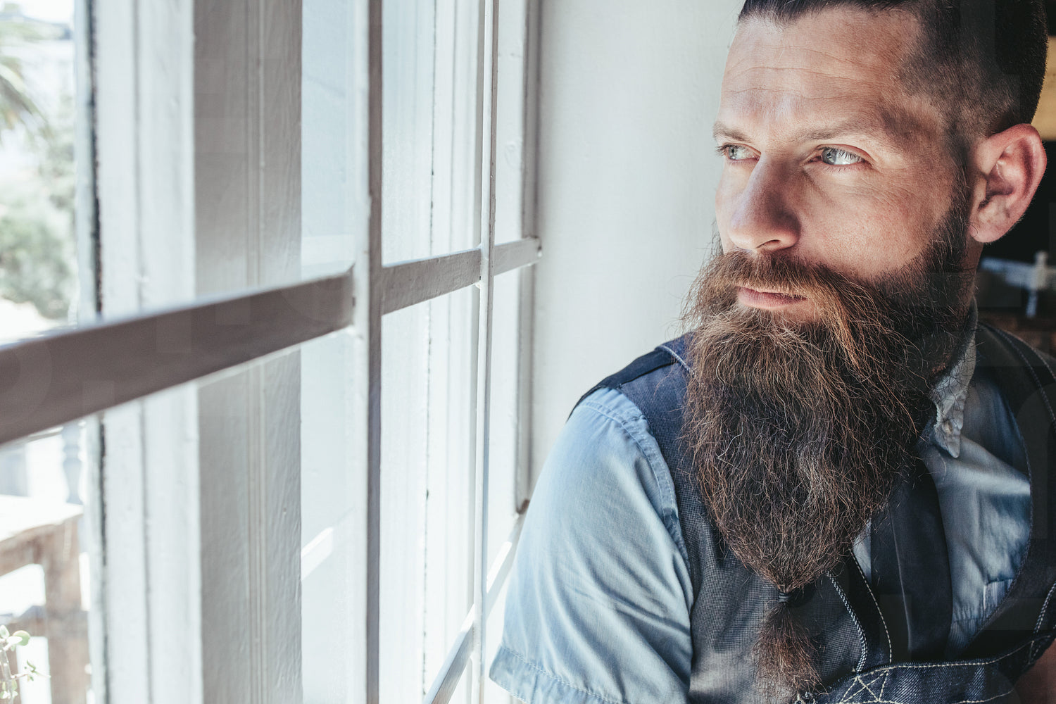 Close up of serious male barber with long beard looking outside the window and thinking.