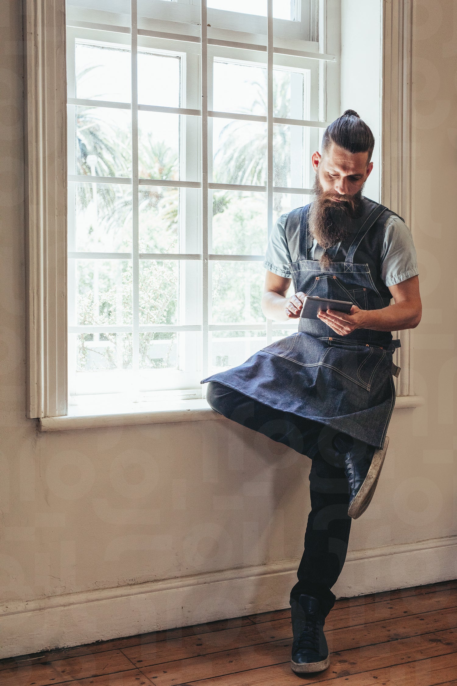 Hairdresser with digital tablet sitting on window sill of salon. Beard man using digital tablet at barbershop.