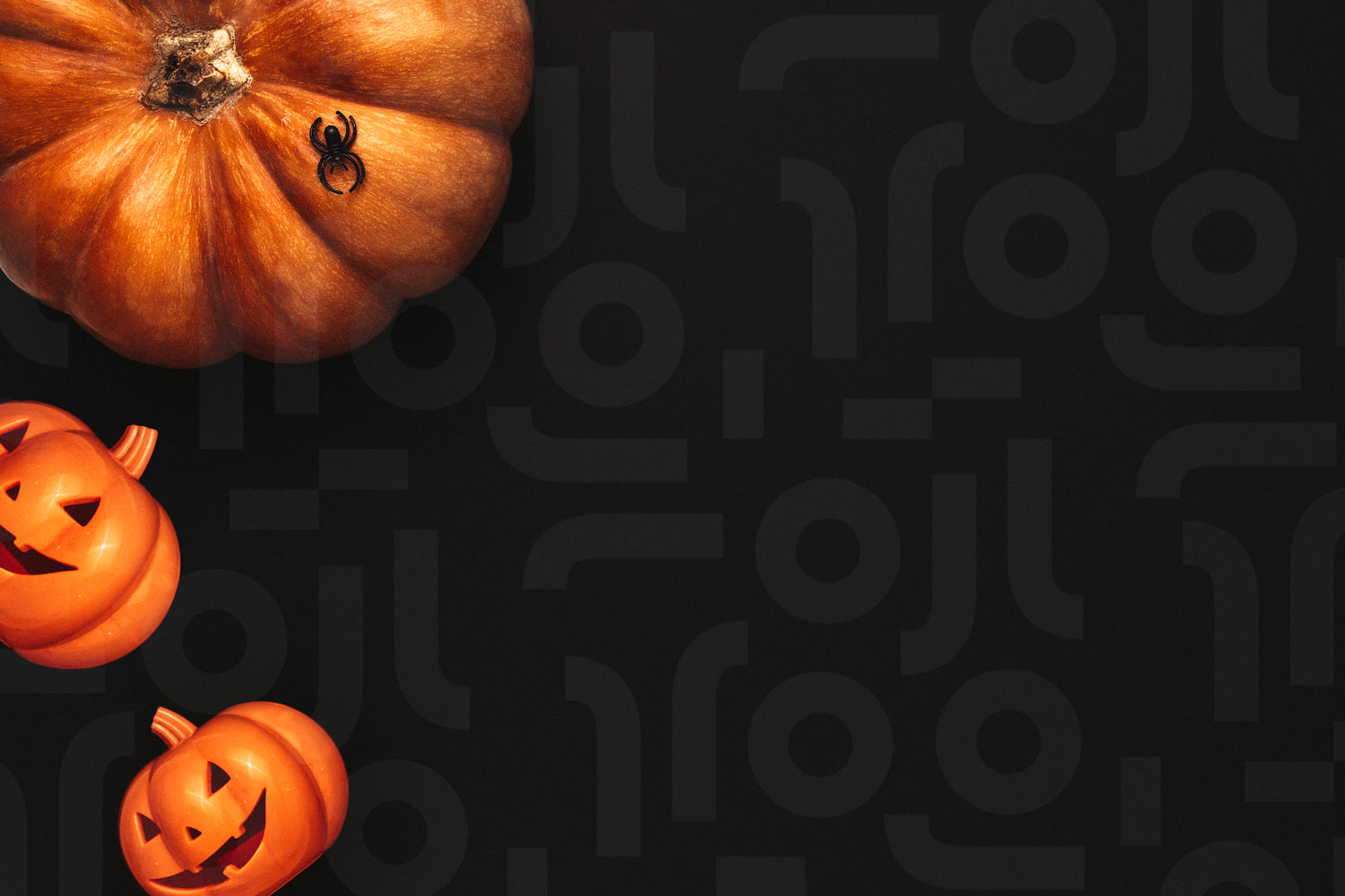 Halloween flat lay design with space for your greetings. Pumpkin heads with spider on black background.