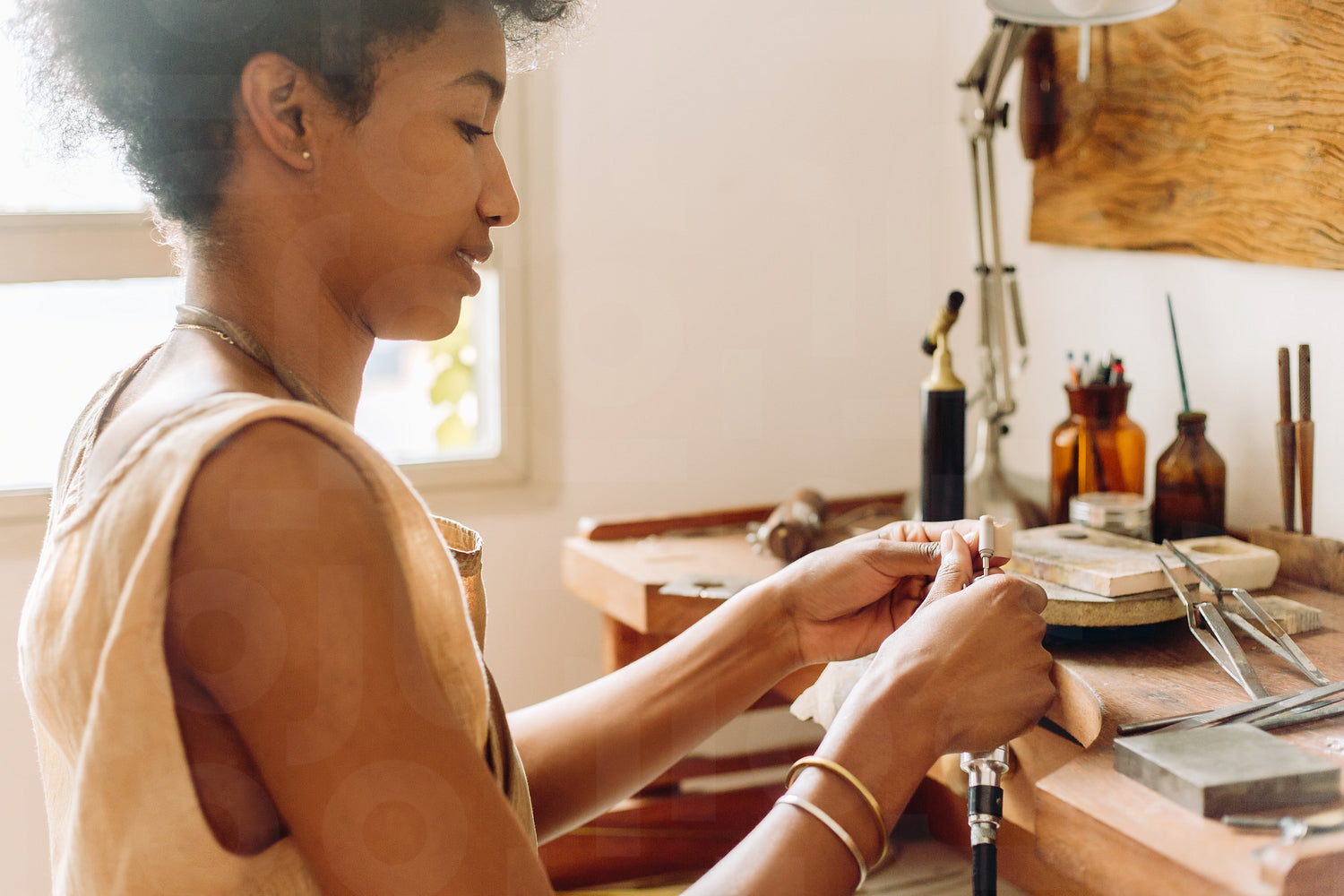 Young designer making accessories in her studio. Female designer working on jewelry product at her workbench using traditional tools.