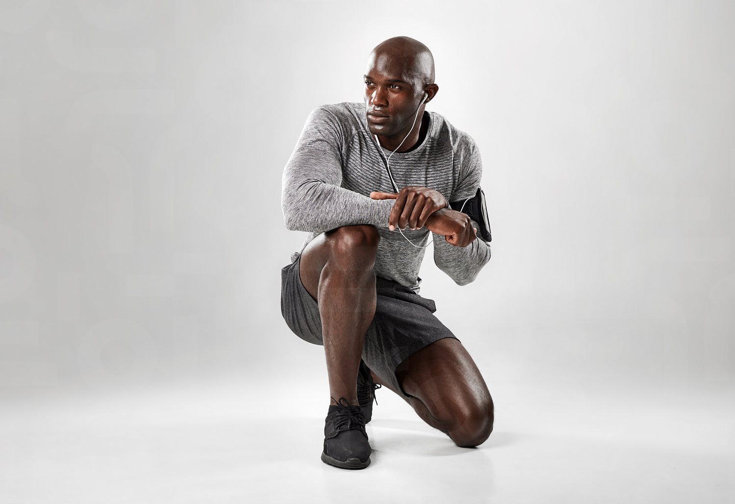 Portrait of handsome young african male model kneeling on grey background and looking away.