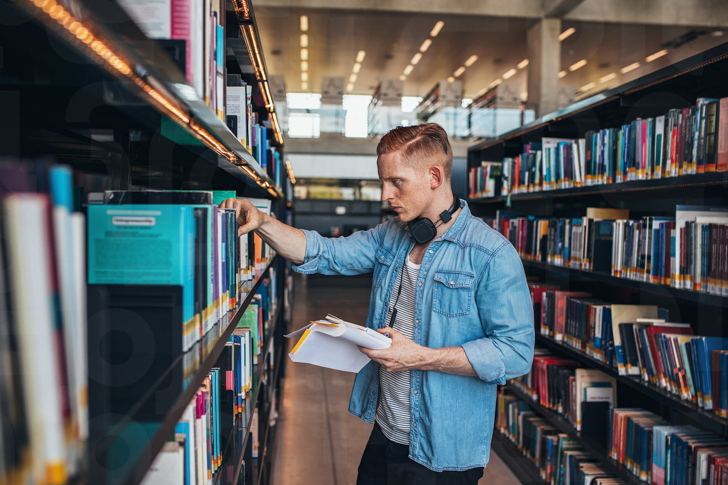 Young college student taking book from shelf in library. Handsome young caucasian man in library.