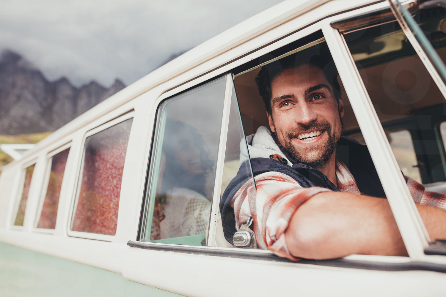 Smiling man driving a van and looking outside. Handsome caucasian male on a road trip with friends traveling by an old minivan.