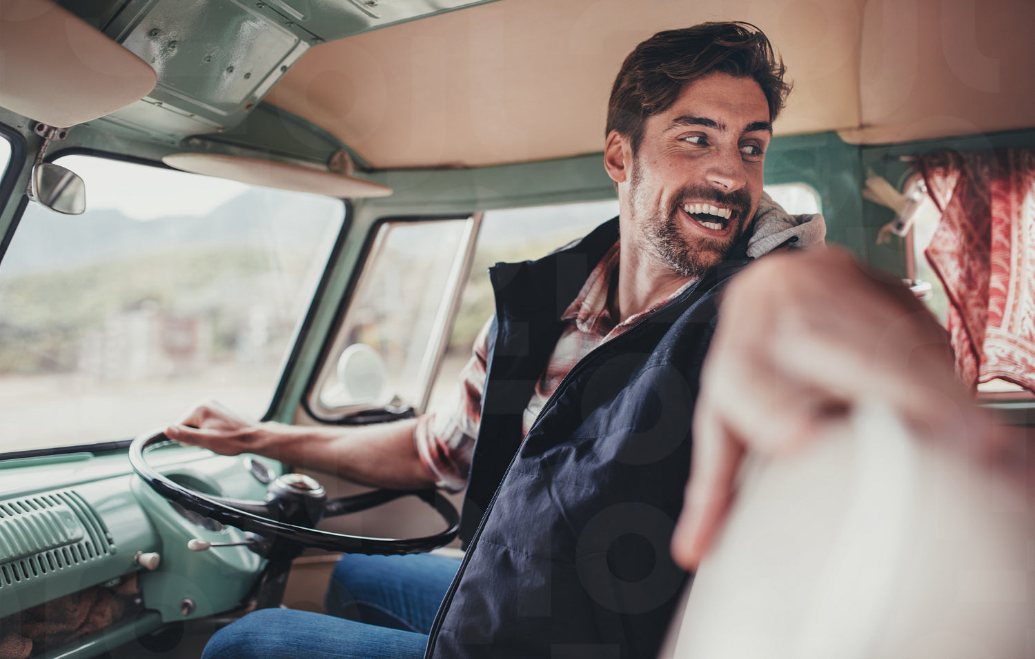 Handsome man on road trip driving a van. Laughing male sitting in driving seat and looking back.