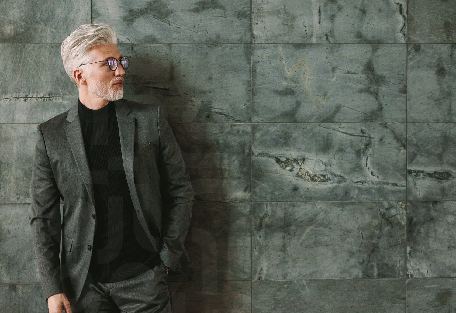 Portrait of handsome mature man in formal attire looking away. Senior businessman standing against grey wall with copy space.