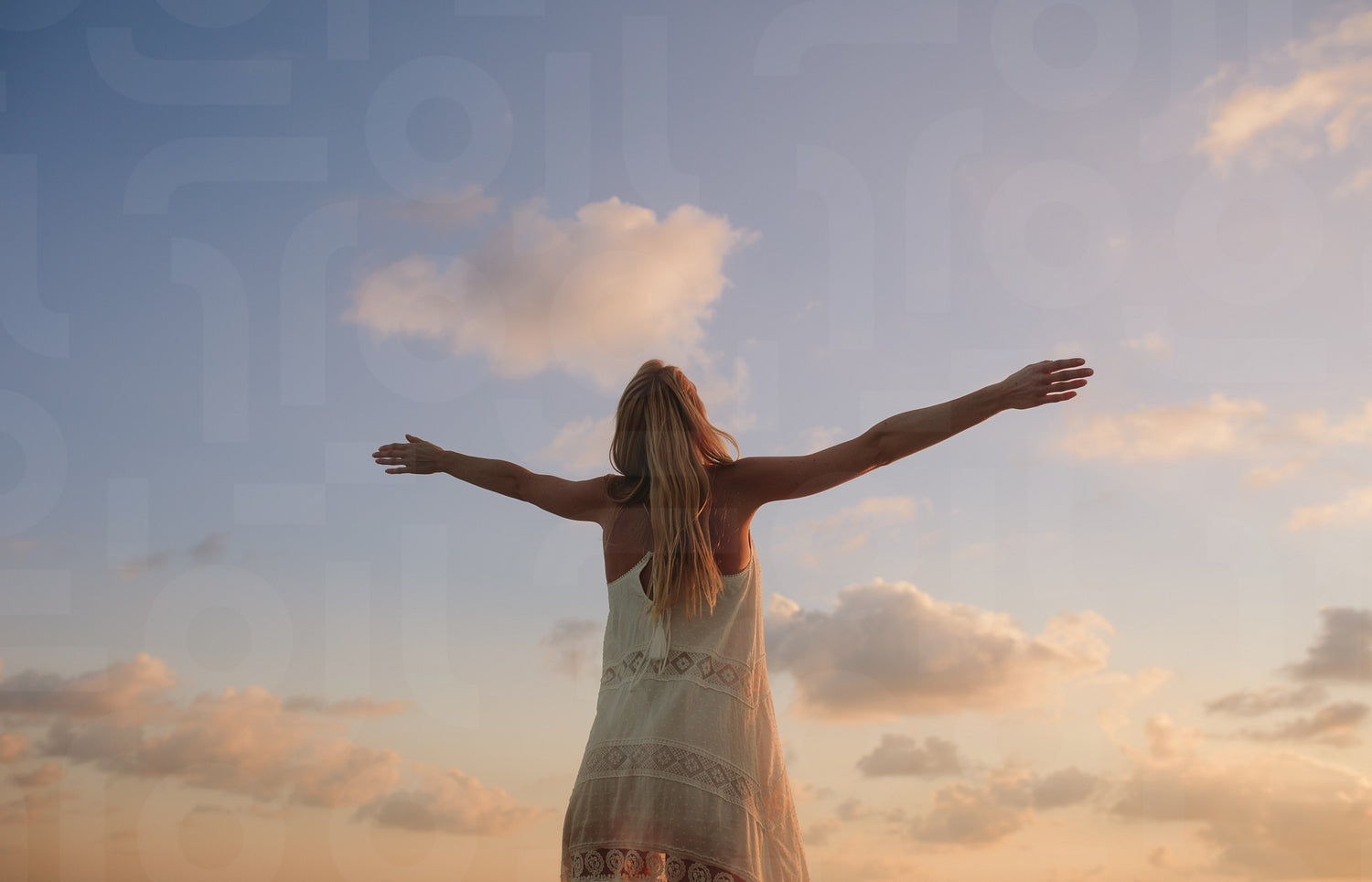 Rear view of a woman standing outdoors with arms stretched enjoying nature. Portrait of a relaxed and happy woman with open arms looking at the sky.