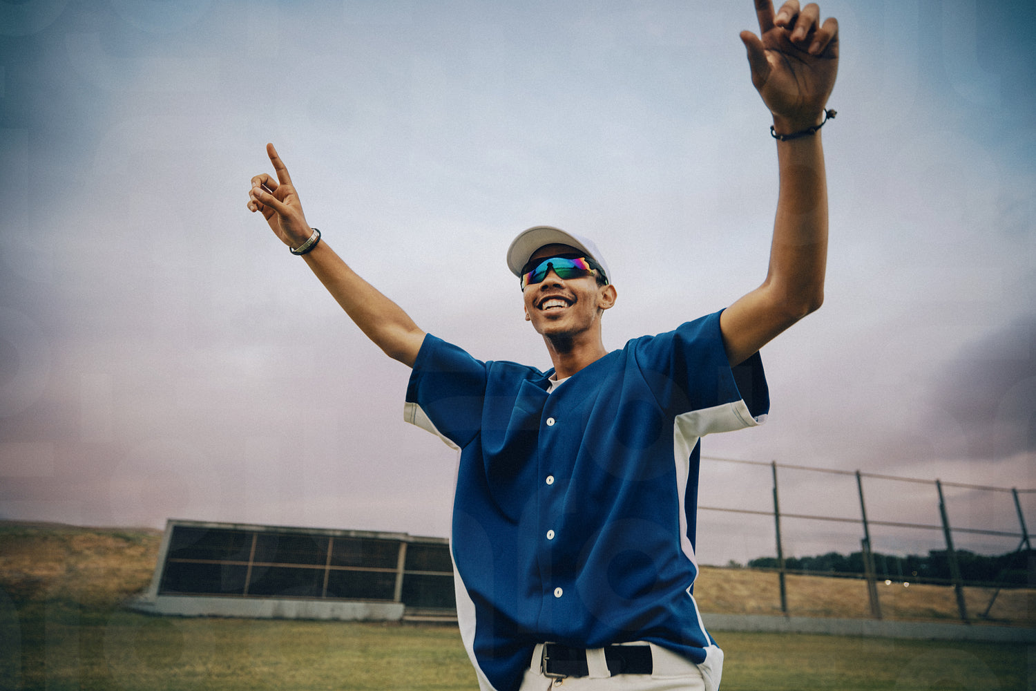 Happy baseball captain celebrating on the field with enthusiasm and joy under a beautiful sky