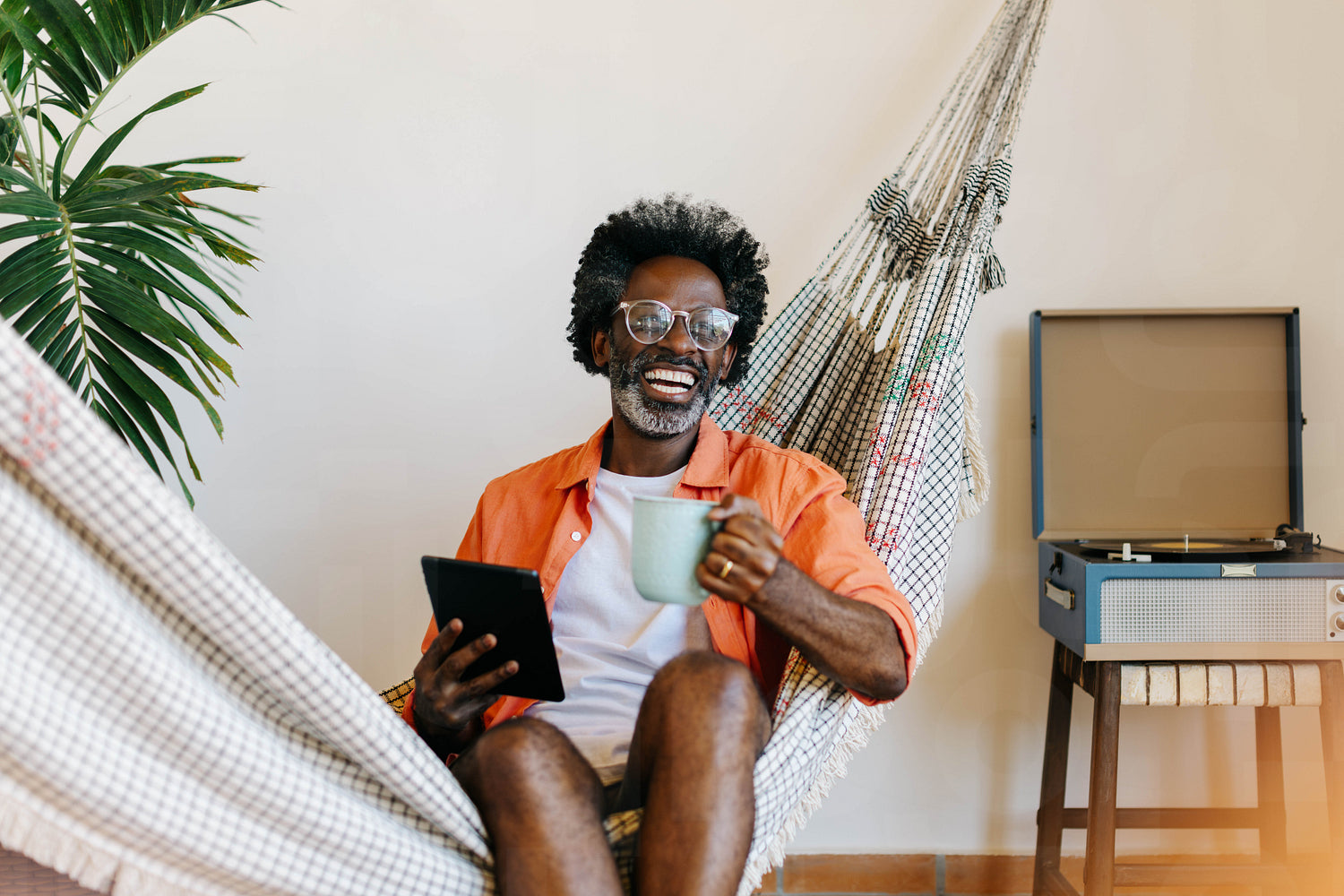 Happy man in glasses sits in a hammock, holding a cup of Brazilian coffee and a tablet. Mature black man enjoying browsing social media, showcasing a relaxed and leisurely lifestyle.