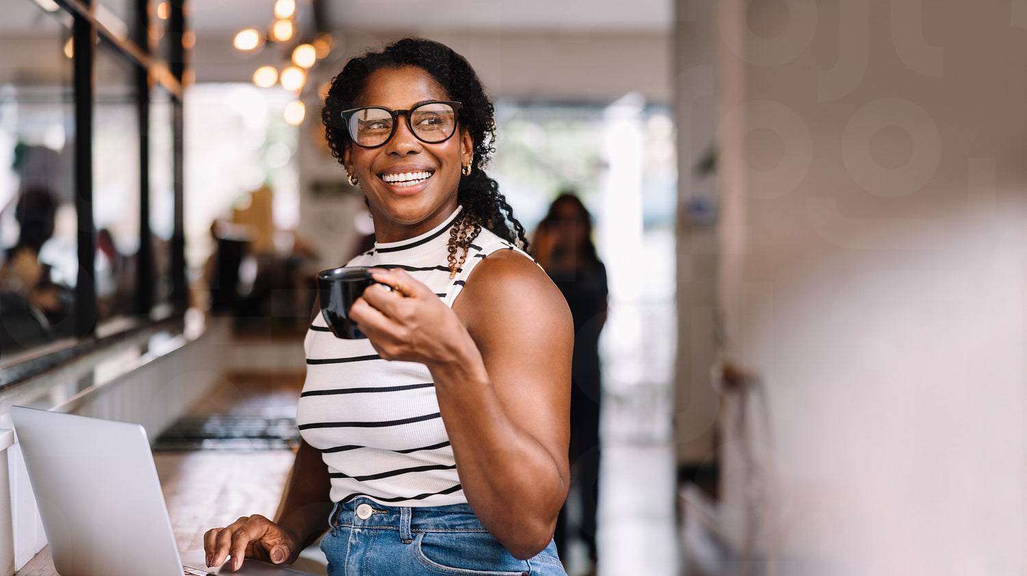 Joyful black woman enjoying a coffee while working on a laptop in a bright, bustling cafe. She smiles, while holding her coffee cup, looking into the distance.