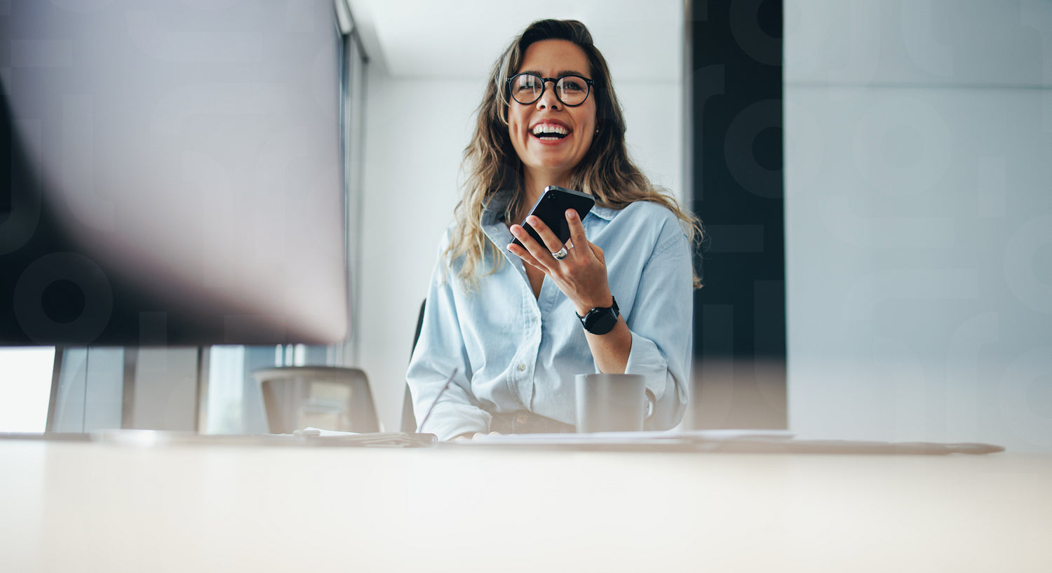 Cheerful businesswoman wearing a business attire sits in her office, talking on the phone and smiling. Young female professional enjoys a productive conversation with her business associates.